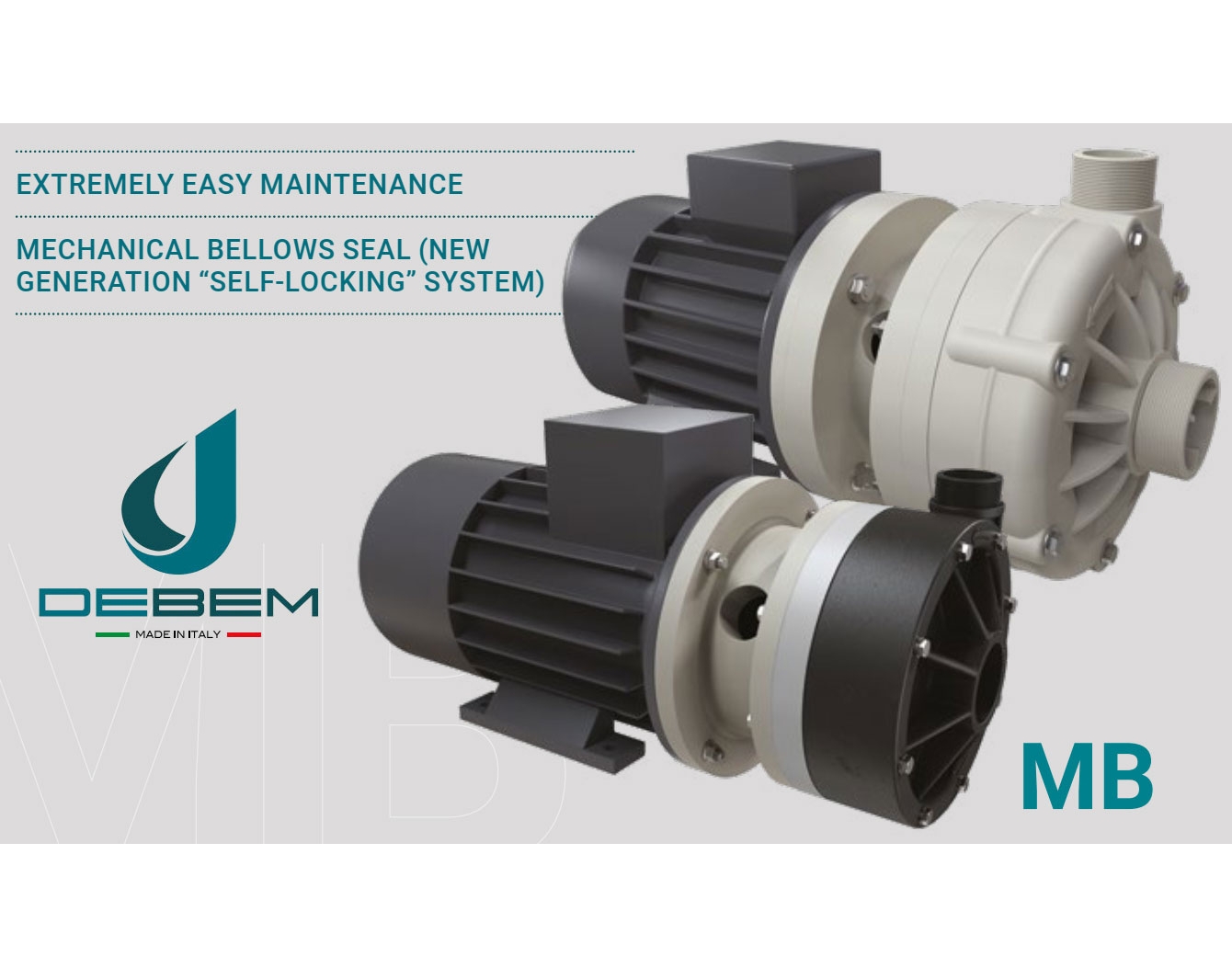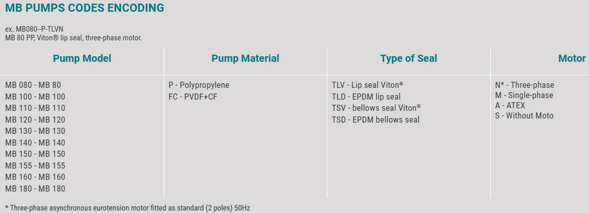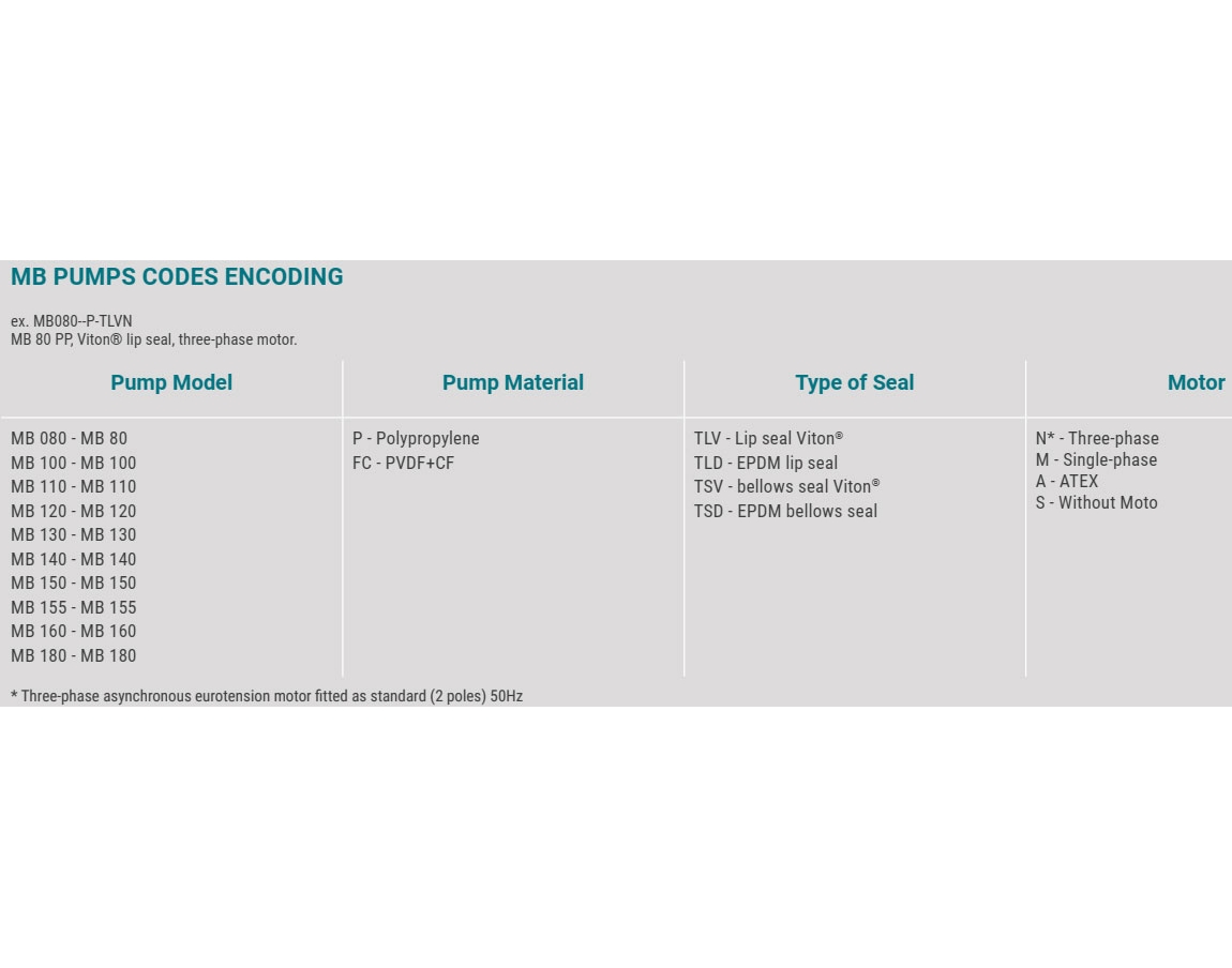 Bơm ly tâm dòng MB là loại bơm có cánh hở được làm bằng nhựa (polypropylene hoặc PVDF). Cấu tạo cánh hở cho phép bơm được cả chất lỏng ô nhiễm cao có chứa các hạt mịn, với độ nhớt lên đến 500 cP (ở 20°C).