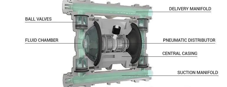The diaphragm, driven by air pressure, expands and moves the liquid into the manifold. The correct direction is ensured by the balls below, which, by gravity, close the passage, preventing the liquid from falling out. / Áp lực khí nén tác động lên màng bơm, làm màng phồng lên, đẩy chất lỏng ra ngoài qua ống góp (manifold). Hướng chảy đúng của chất lỏng được đảm bảo bởi các viên bi van bên dưới, chúng đóng lại nhờ trọng lực để ngăn chất lỏng chảy ngược trở lại buồng hút.