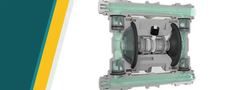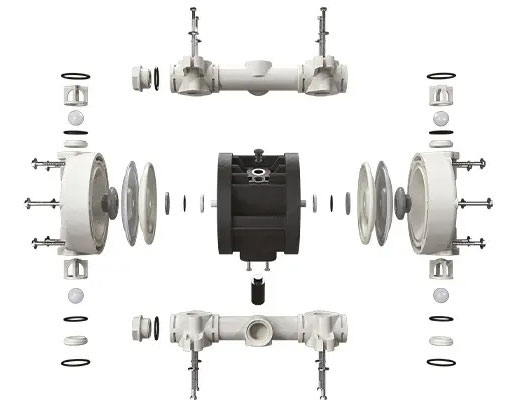 The Fluid Chambers: house the volumes within which fluid is drawn in and pumped out. The fluid chambers include the membranes (green and yellow in the image below) and sometimes include the housing of balls having a similar function to the inlet and outlet check valve. A vacuum is created inside the chamber where diaphragms alternately draw in fluid and push it out from each side to create the pumping action. / Là nơi chứa dung dịch khi được hút vào và bơm ra. Bên trong buồng có các màng bơm (thường được ký hiệu bằng màu xanh và vàng trong sơ đồ) và các bi van (ball check valves) ở đầu vào – đầu ra giúp ngăn dòng chảy ngược. Khi màng di chuyển, một bên tạo chân không để hút chất lỏng, trong khi bên kia đẩy chất lỏng ra ngoài, hình thành chu kỳ bơm.