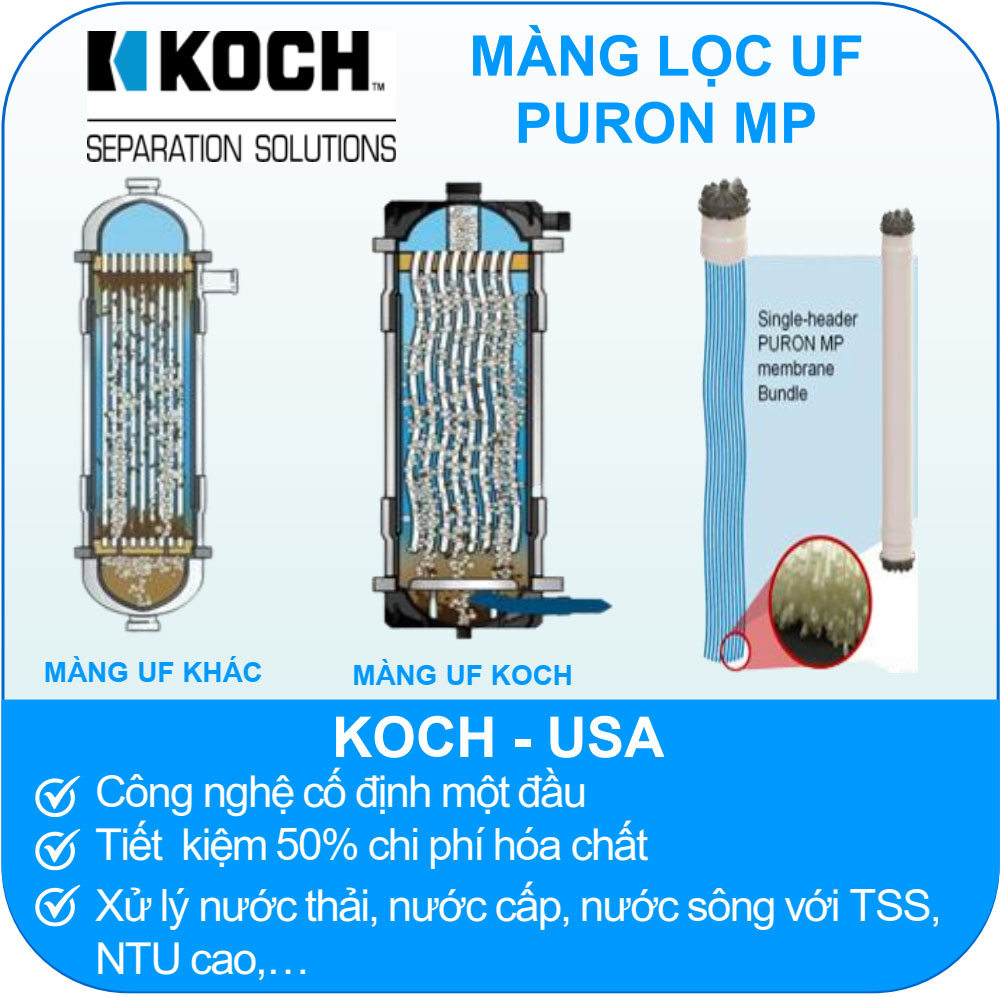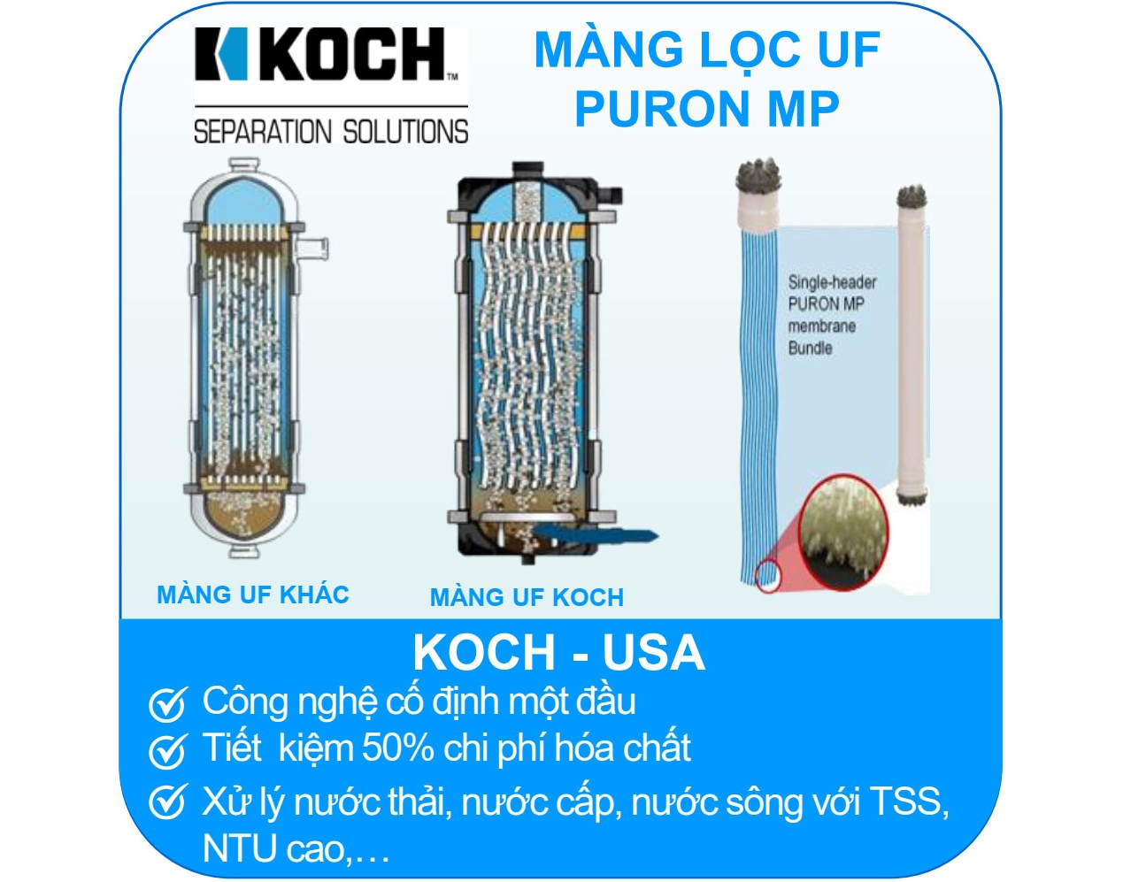 Màng UF KOCH - USA: Với công nghệ cố định một đầu kết hợp với hệ thống sục khí trung tâm => giảm tình trạng màng bị ngẹt Bùn và Đứt Gãy như các loại Màng UF thông thường, nên tuổi thọ cao hơn + vận hành với TSS có thể lên tới 1000mg/l.