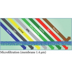 Microfiltration is a low pressure-driven membrane filtration process, which is based on a membrane with an open structure allowing dissolved components to pass while most non-dissolved components are rejected by the membrane. In the dairy industry, microfiltration is widely used for bacteria reduction and fat removal in milk and whey as well as for protein and casein standardisation. / Trong ngành công nghiệp Sữa => Màng vi lọc MF được sử dụng rộng rãi để loại bỏ vi khuẩn và chất béo trong Sữa, cũng như Đạm, Protein, Casein.