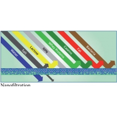 Nanofiltration is a medium to high pressure-driven membrane filtration process. Generally speaking, nanofiltration is another type of reverse   osmosis where the membrane has a slightly more open structure allowing predominantly monovalent ions to pass through the  membrane.  Divalent ions are - to a large extent - rejected by the membrane. In the dairy industry, nanofiltration is mainly used for special applications such as partial demineralisation of whey, lactose-free milk or volume reduction of whey. /  Trong ngành công nghiệp sữa, lọc nano chủ yếu được sử dụng cho các ứng dụng đặc biệt như khử khoáng một phần whey, sữa không lactose hoặc giảm thể tích whey.