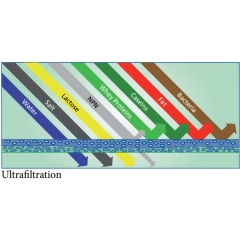 • Milk Protein Concentrate: Ultrafiltration is commonly used in the production of Milk Protein Concentrate (MPC) where it can lead to an increase of the protein content in the total solids. The by-product (permeate) is perfectly suited for lowering the protein content of other products such as e.g. skim milk powder. Màng Siêu Lọc UF để cô đặc sữa trong sản xuất Sữa giày Protein, dòng Permeate có thể được sử dụng làm sản phẩm sữa tách béo.