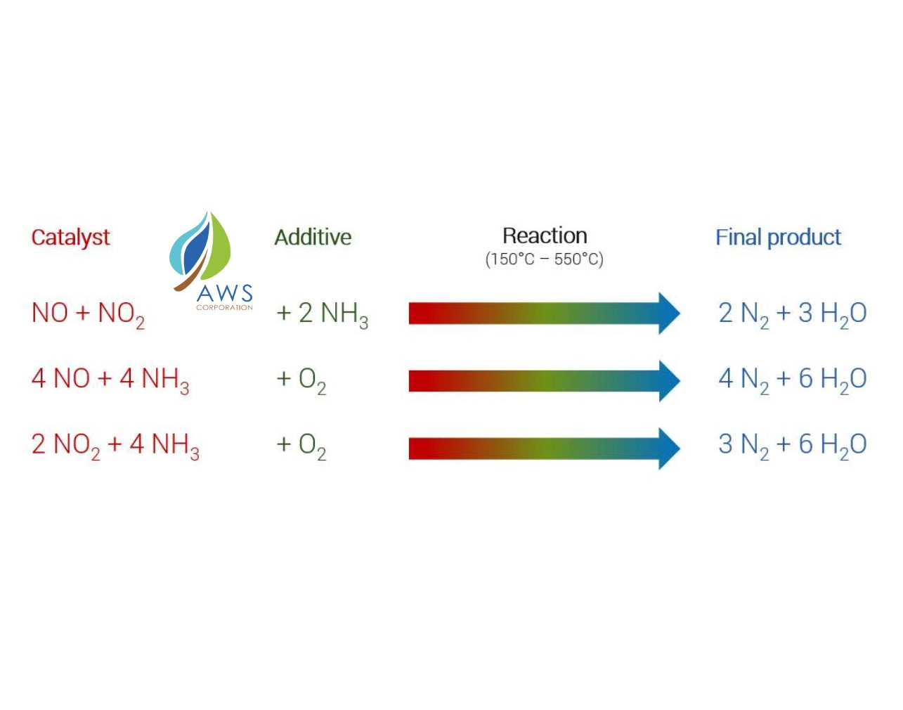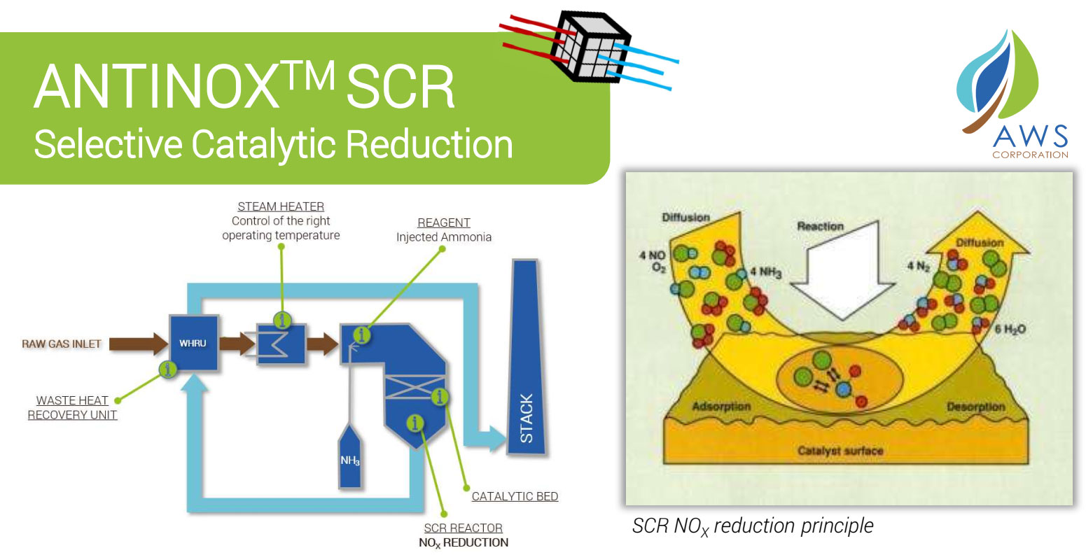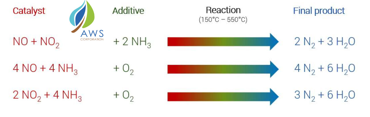 AWS Selective Catalyst Reduction (SCR) system for flue gas denitrification consists of a NOX reduction process on a catalytic bed, using Ammonia or Urea as reagent. / Hệ thống SCR của AWS cho quá trình khử NOx trong khí thải lò đốt bao gồm giai đoạn giảm NOx trên lớp xúc tác, sử dụng Amoniac hoặc Urea làm tác nhân phản ứng.