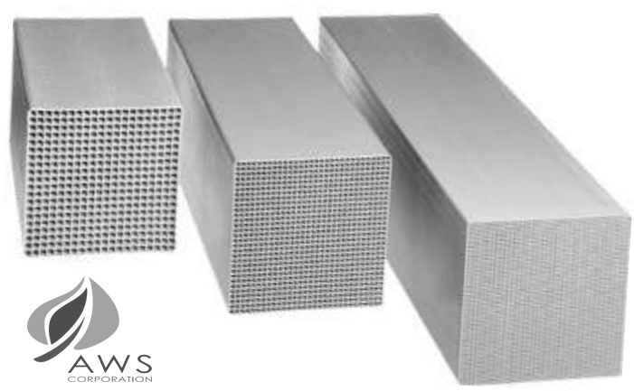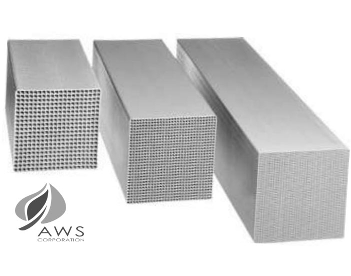 Honeycomb catalysts, together with Ammonia or Urea addition, enable the efficient reduction of NOX emissions by promoting the selective catalytic reaction. / Xúc tác dạng tổ ong (Honeycomb catalyst), kết hợp với bổ sung Amoniac hoặc Urea, cho phép giảm phát thải NOx hiệu quả thông qua phản ứng chọn lọc xúc tác.