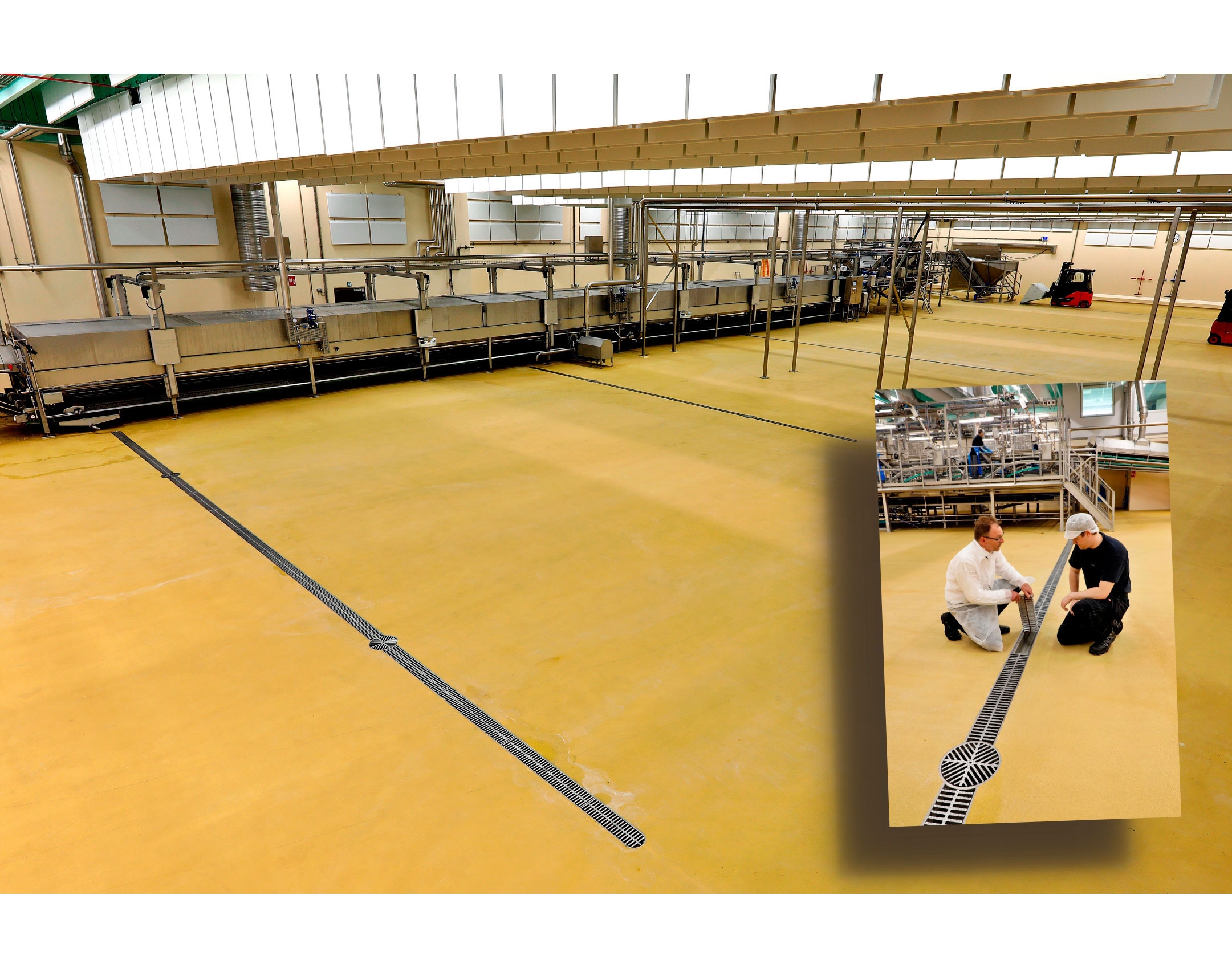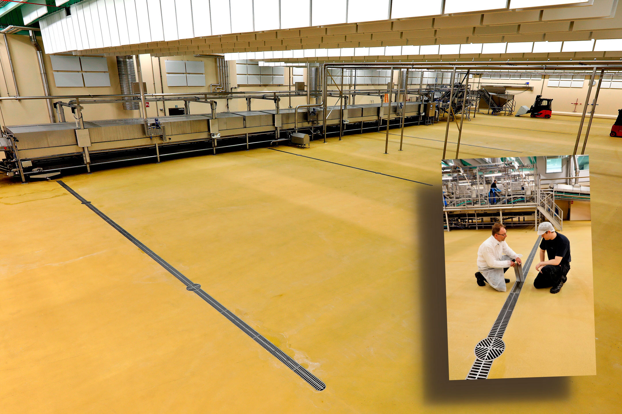 The factory flooring poses the biggest hygienic challenge since this is the area with most waste, humidity and physical stress. A hygienically designed and efficient drainage system can form a barrier between the contaminated sewer system and the clean production area. / Sàn nhà xưởng là khu vực có thách thức vệ sinh lớn nhất, vì đây là nơi có nhiều chất thải, độ ẩm và chịu tác động cơ học mạnh. Một hệ thống thoát nước được thiết kế hợp vệ sinh và hiệu quả có thể đóng vai trò như một hàng rào ngăn cách giữa hệ thống thoát nước bẩn và khu vực sản xuất sạch.