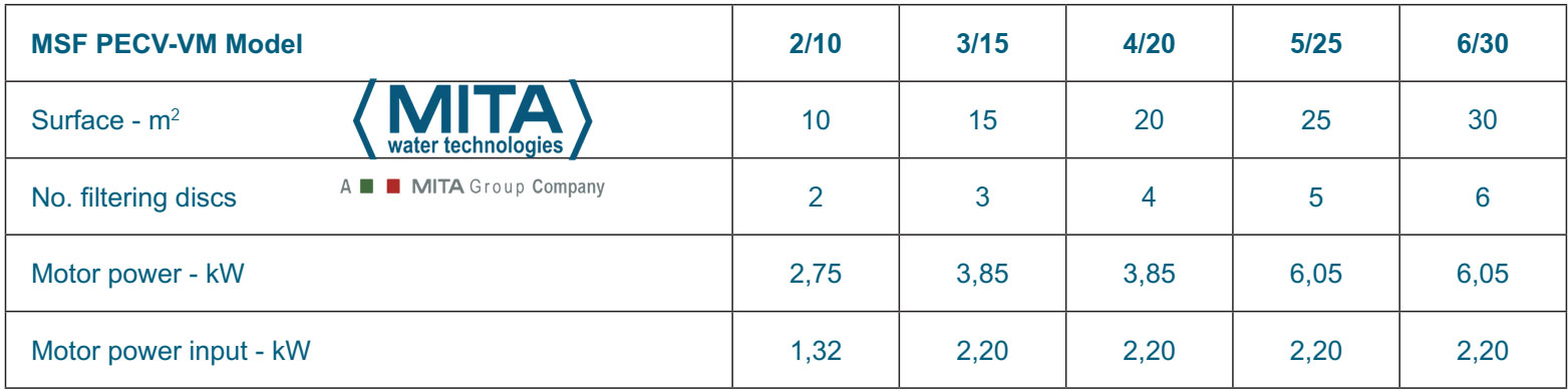 Ở dòng MSF, vải lọc được gắn trên các mô-đun nhựa, mỗi 6 mô-đun tạo thành 1 đĩa, và tối đa 32 đĩa cho mỗi máy lọc. Mỗi đĩa có diện tích lọc 5 m², tương ứng 160 m² cho máy 32 đĩa. Tất cả các đĩa đều ngập hoàn toàn trong nước thải, giúp tận dụng 100% diện tích lọc.