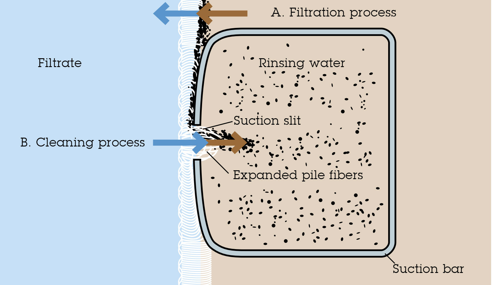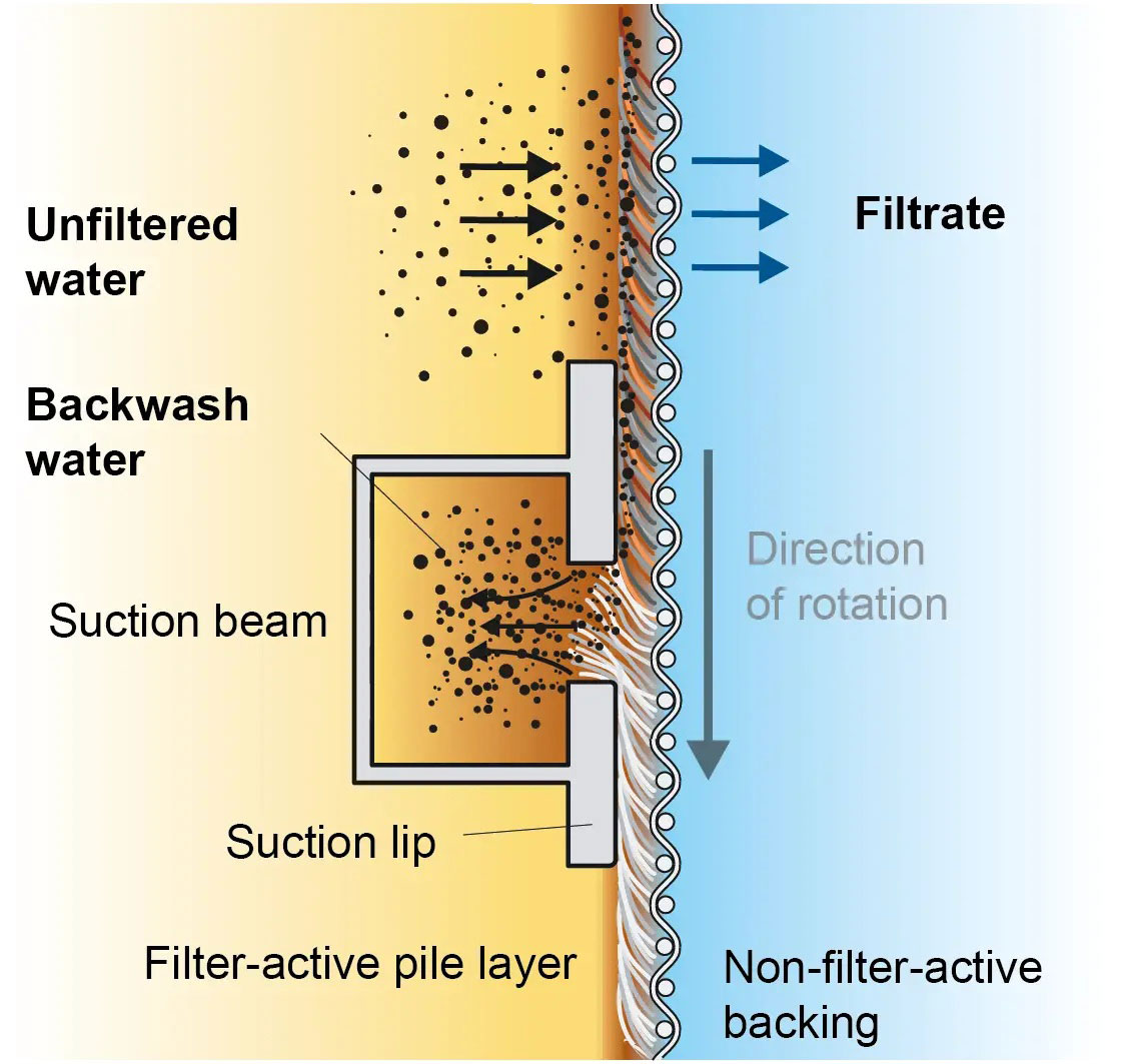 Trong quá trình rửa ngược, sợi vải được nâng lên nhờ lực hút, giúp loại bỏ dễ dàng chất rắn bám giữ.