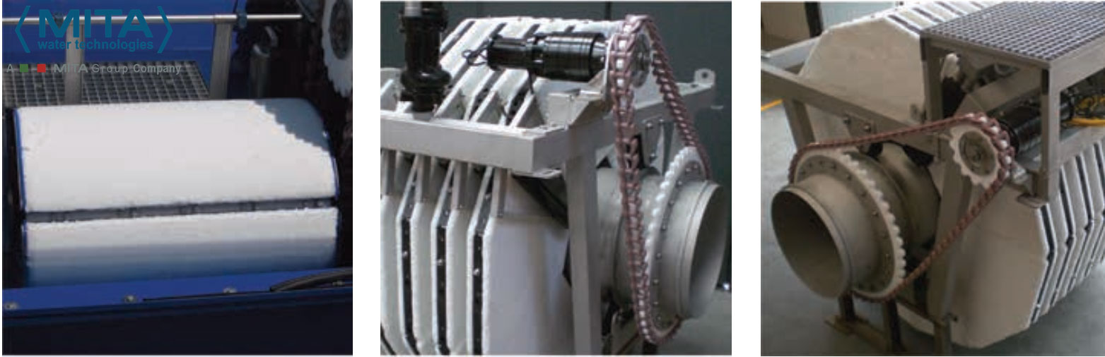 Bộ lọc được đỡ ở hai đầu bằng hai cụm con lăn phi kim loại, giúp loại bỏ hoàn toàn nguy cơ hư hỏng bạc đạn (bearing failure). Các mô-đun lọc có thể tháo rời dễ dàng chỉ với hai đai ốc, giúp thay thế vải lọc nhanh chóng và thuận tiện. Bơm hoặc vòi hút (backwash shoe) cũng có thể tháo rời hoàn toàn và dễ dàng để phục vụ bảo trì, sửa chữa.