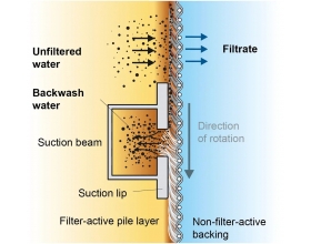 The filter discs are slowly rotated, and the solids attached to the cloth are removed by the backwash shoe, which is a suction device, operated by the pump. / Các đĩa quay chậm, cặn bám trên vải được hút sạch bởi bơm và vòi hút.