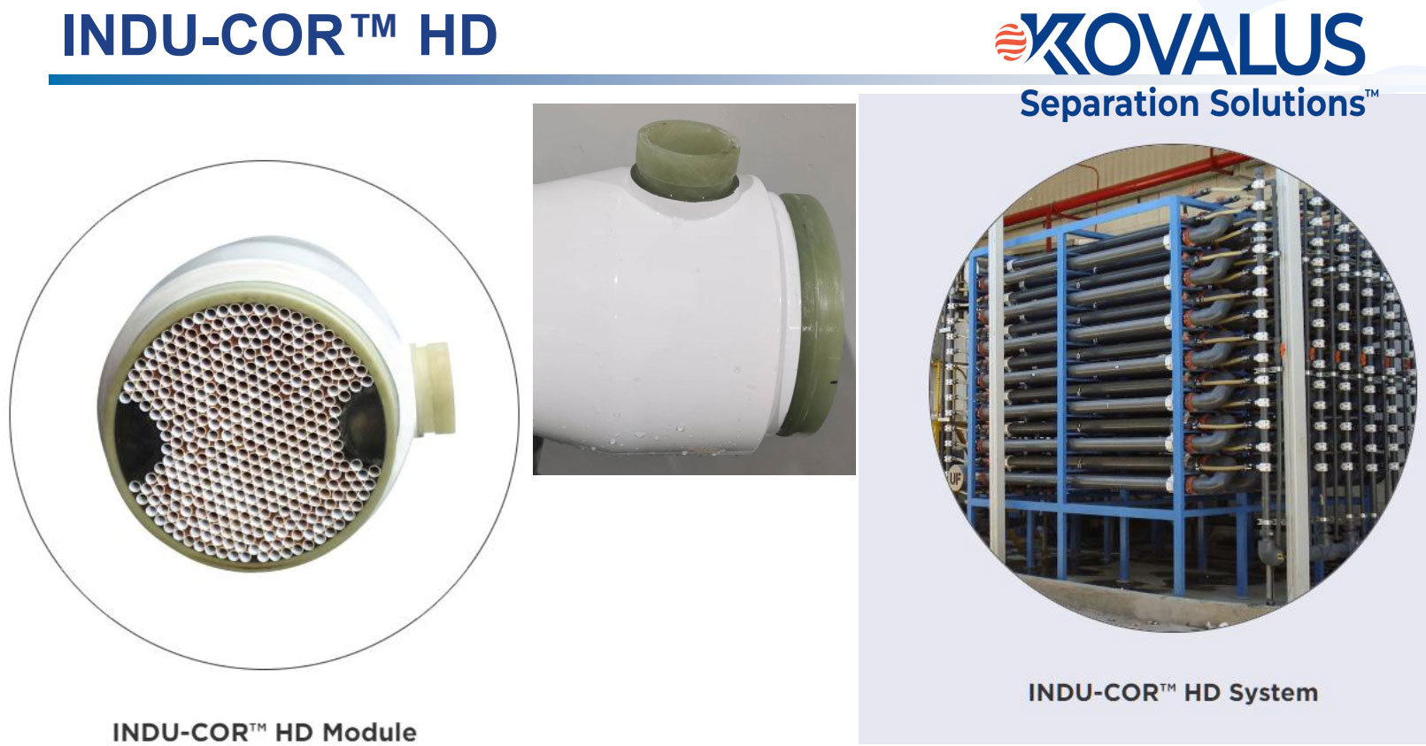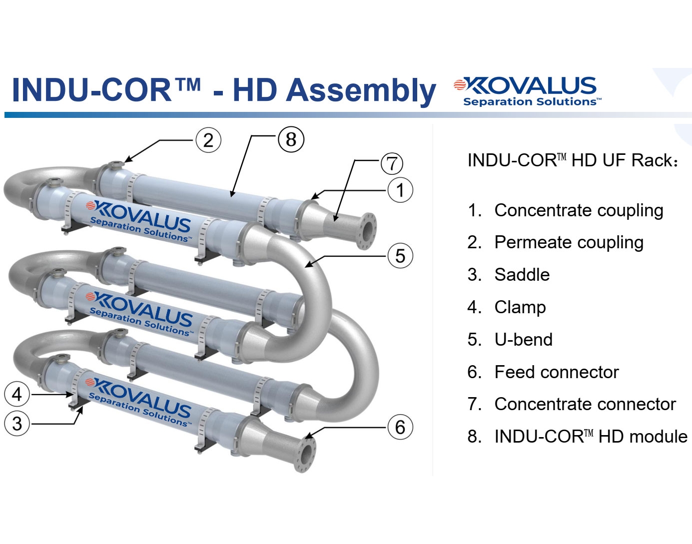 Trái tim của công nghệ màng ống siêu lọc (Tubular UF) INDU-COR® HD do Kovalus Separation Solutions, LLC (KSS) cung cấp là các ống rỗng PVDF đường kính trong 8 mm. Bằng cách bố trí số lượng ống khác nhau, Kovalus tạo ra các mô-đun đa ống (multi-tube modules) với kích thước và diện tích lọc khác nhau, đáp ứng đa dạng yêu cầu ứng dụng. Vỏ mô-đun (module shell) có thể được chế tạo từ FRP (Fiberglass Reinforced Plastic) hoặc CPVC (Chlorinated Polyvinyl Chloride), phù hợp cho nhiều loại nước và dung dịch công nghiệp khác nhau. Các mô-đun INDU-COR® HD nổi bật với những đặc tính kỹ thuật vượt trội:
