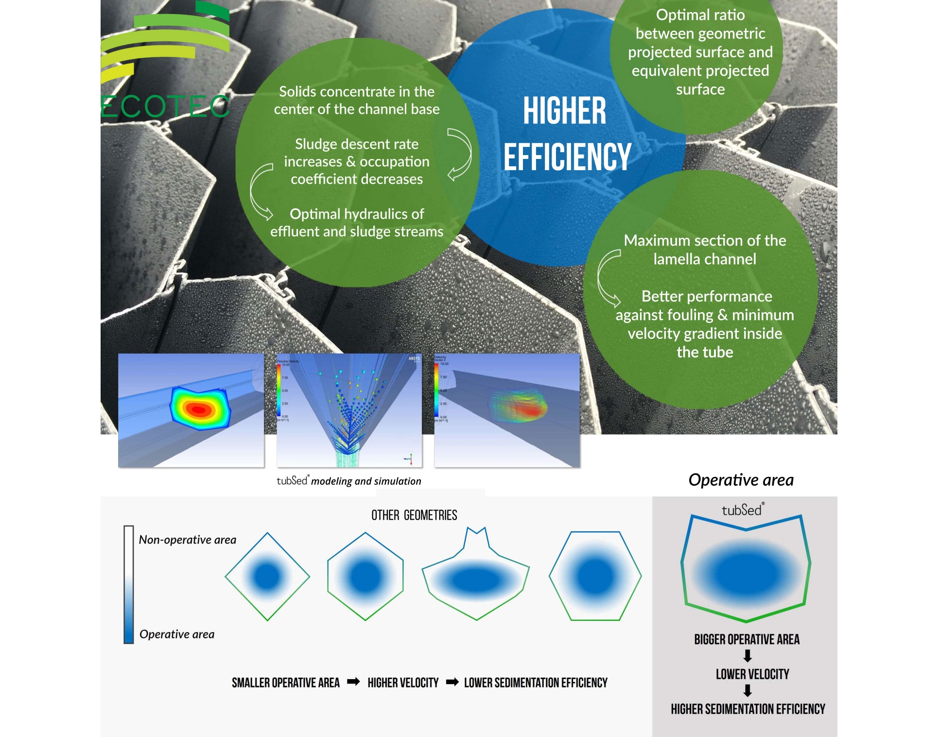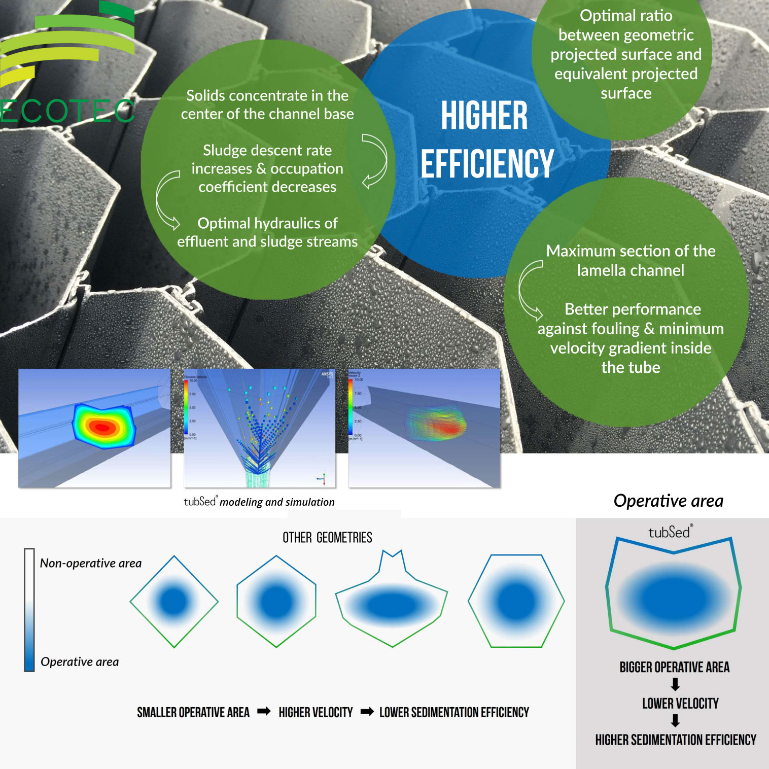 Thiết bị lắng dạng ống/ Tấm lắng lamella bao gồm một loạt các tấm hoặc kênh nghiêng mang lại diện tích bề mặt hiệu quả lớn với diện tích nhỏ. Kết quả là, bể có tấm lắng lamella nhỏ hơn đáng kể so với bể lắng thông thường. Diện tích bề mặt bổ sung rút ngắn đường đi của hạt cùng với thời gian lắng của nó. Ngoài ra, độ nghiêng của tấm trong khoảng từ 55° đến 60° tạo ra dòng chảy ngược cân bằng giữa bùn và nước. Cuối cùng, điều này tăng cường quá trình giải quyết.