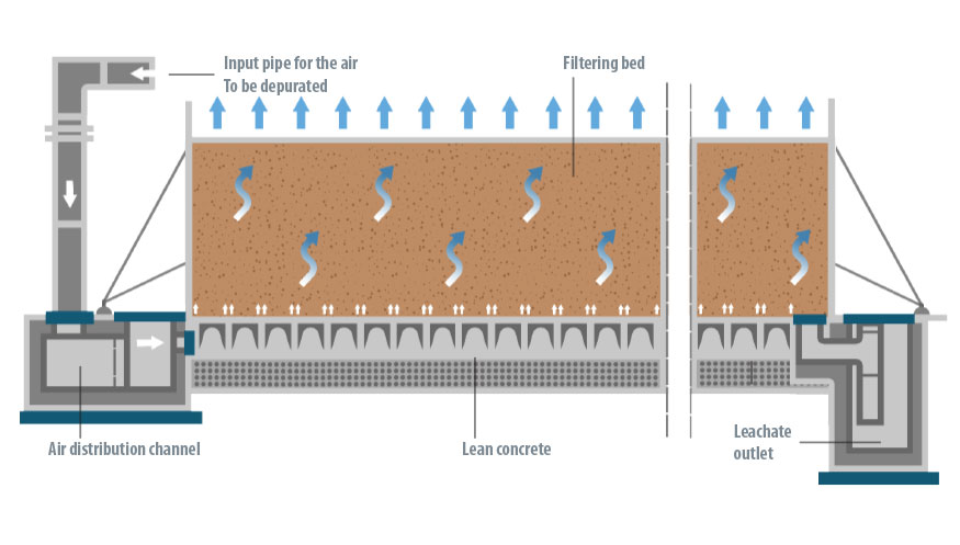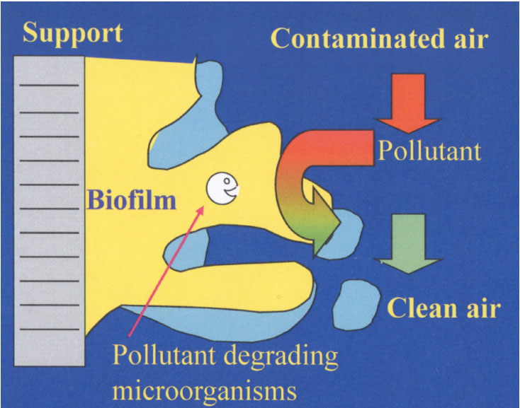 Không khí đi vào bộ lọc sinh học theo hướng từ dưới lên trên qua lớp vật liệu lọc, vốn được cấu thành từ một nền hữu cơ có lớp màng sinh học chứa các vi sinh vật. Các vi sinh vật này sẽ chuyển hóa (phân giải) các chất ô nhiễm trong không khí đang được xử lý.