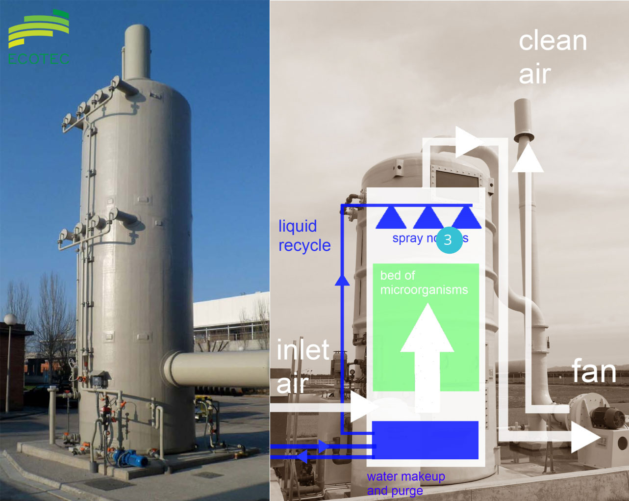 Lọc sinh học là bước đi đầu tiên của ECOTEC trong xử lý sinh học không khí. Thiết bị này sử dụng vật liệu hữu cơ (được duy trì ở độ ẩm thích hợp) để tạo điều kiện cho vi sinh vật phát triển, từ đó hấp thụ và phân hủy các hợp chất gây mùi.